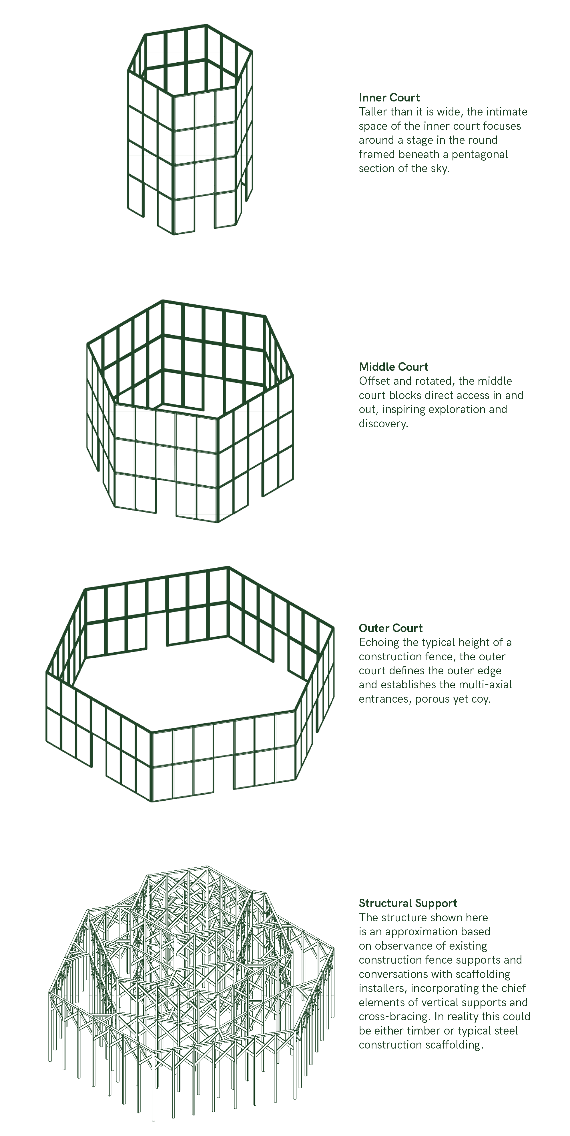 Hunter Green, the pavilion, seeks to intervene on the material cycles of the ubiquitous sidewalk shed, by sequestering a batch of these shed panels on the site in Roosevelt Island between jobs. It would be the first such structure employing these materials which subverts their intended function by focusing not on public exclusion, but on public engagement. The successive hexagonal layers step back and up creating a starkly monumental architectural form, but one that is completely porous with openings on all sides and in all layers.
